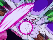 Back on the battlefield, Frieza's new power level is said by him to be over one million. He also tells Vegeta about the destruction of the planet Vegeta and his father. Vegeta simply scoffs at this, saying that he surpassed his father when he was a child. After fully transforming, he impales Krillin with his horns, who was trying to protect Dende, and tosses him to the sea. Gohan tries to save him, but when Frieza stops him, an incredibly angry Gohan easily beats down Frieza and pummels him with many ki blasts. Despite Vegeta's shocked reaction, the attack is not enough and Frieza recovers with little damage done. Luckily, Dende rescued Krillin out of the sea, telling Gohan that he is still alive. Angry that he was actually was hurt by the attack, Frieza then easily pounds Gohan, hurting him severely. Vegeta tries to attack when Frieza's back is turned, but it is completely ineffective and Gohan is left almost dead. Gohan is saved when Krillin launches a Destructo Disc at Frieza and cuts off his tail. Dende then uses this time to heal Gohan as Vegeta watches. It was revealed that Dende was the one who plucked Krillin out of the sea and healed him. Krillin continues to distract Frieza using many evasive maneuvers, such as Solar Flare. Soon, Gohan is healed and now stronger than ever due to his Saiyan genes.