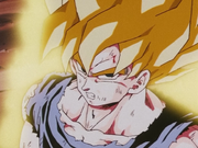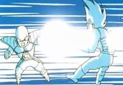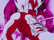 Gohan then launches a Wild Rush Blaster that proves to be challenging for Frieza, until he deflects it back. Luckily, Piccolo saves Gohan in the nick of time with a blast. Frieza realizes that Gohan is a Saiyan and that he and Vegeta are constantly getting stronger. He then decides to transform into his final and strongest form, his original being. Vegeta comes up with the idea for Krillin to blast him to near death and for Dende to heal him afterwards, increasing his power enough to become a Super Saiyan. Although Krillin is highly reluctant at first, he blasts Vegeta in the stomach, piercing him through. Because of Saiyan heritage, recovery from a near-death experience causes Vegeta to increase in strength significantly. While Frieza transforms, Dende heals Piccolo and reluctantly heals Vegeta. Vegeta becomes confident that he has become a Super Saiyan.